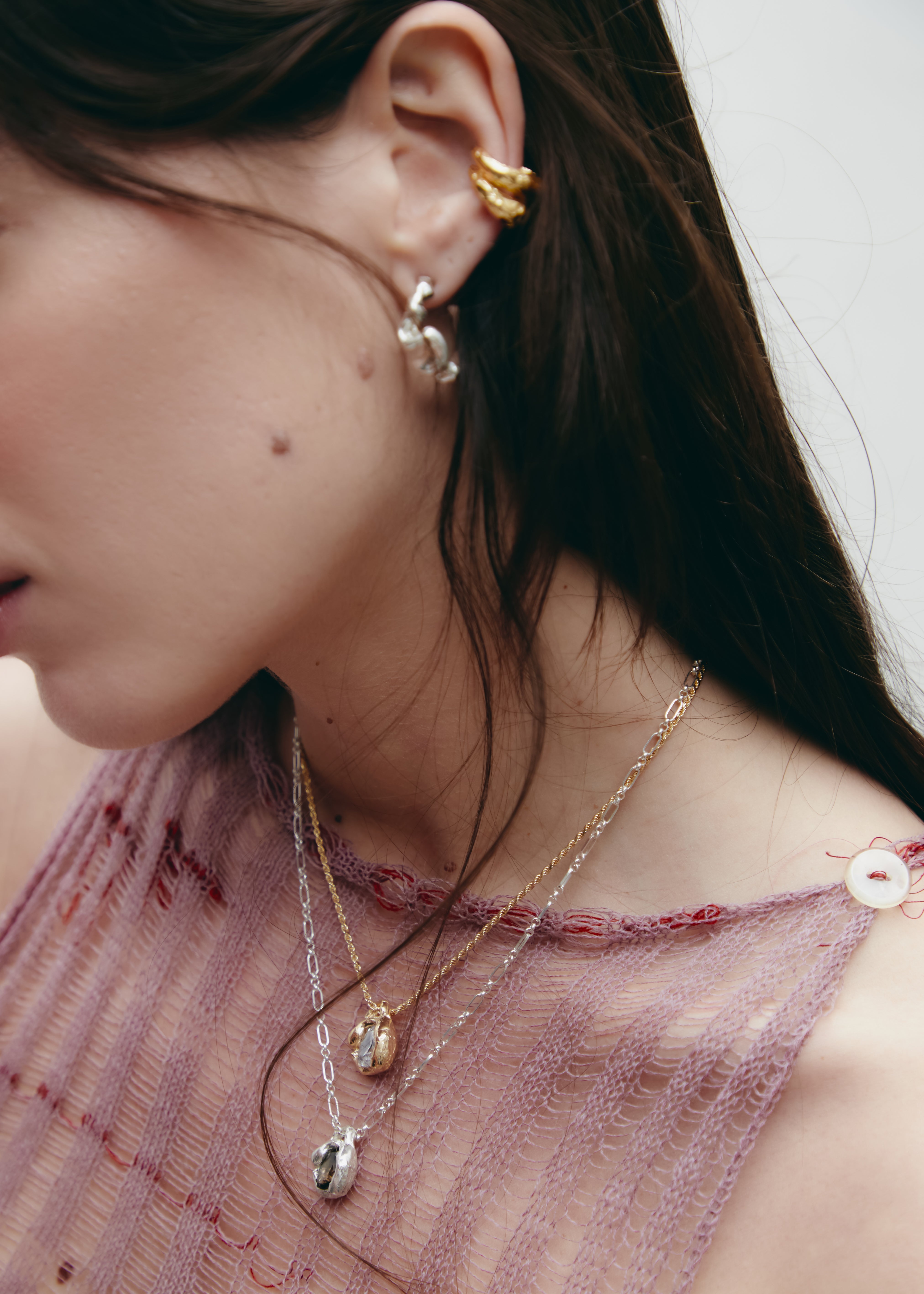 Pendant in 925 recycled silver plated in 18k gold with a natural stone set at its center. The metal embraces the stone in an organic form, as if it emerged from within, reflecting the bond between matter and origin. Handmade in Barcelona, following the legacy of traditional jewelry, reinterpreted from a contemporary perspective.
