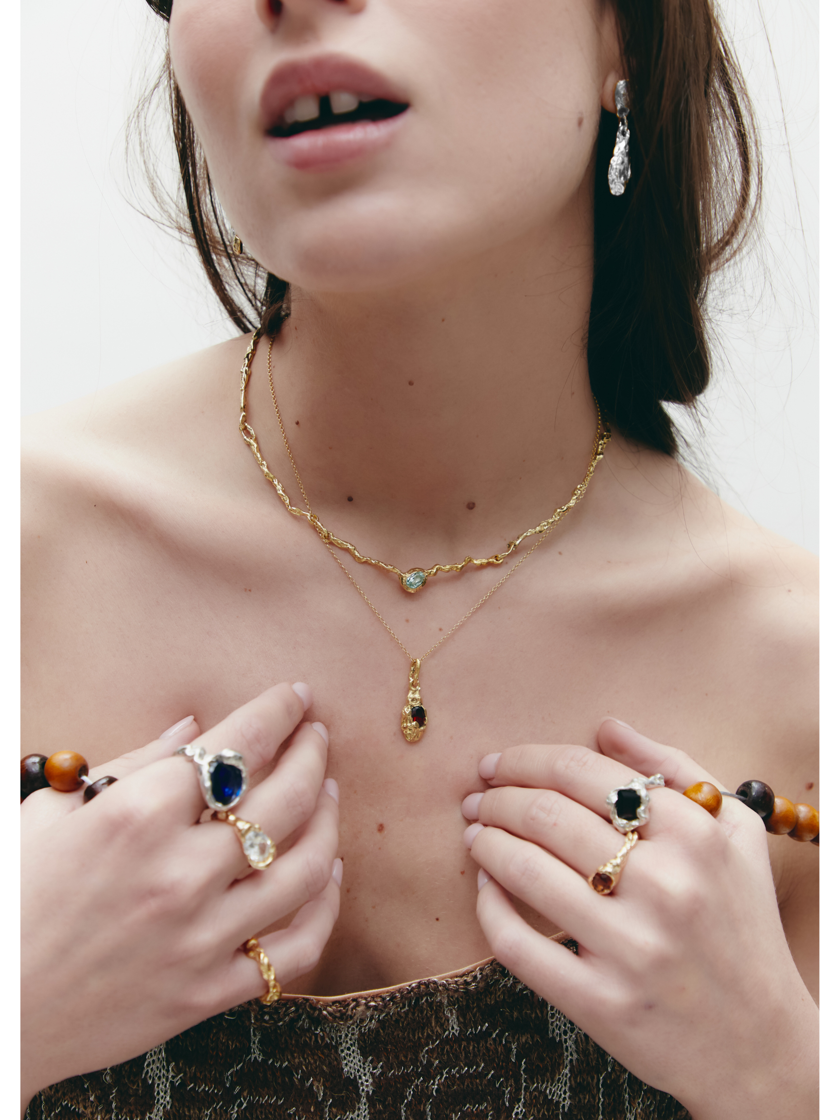 Earrings made of 925 recycled silver, composed of two connected bodies: the upper part holds a natural stone, while the lower irregular silver form falls with organic movement. Their design allows them to be worn individually or combined with other pieces in the collection, creating asymmetrical compositions. Handmade in Barcelona, following the legacy of traditional jewelry, reinterpreted from a contemporary perspective.