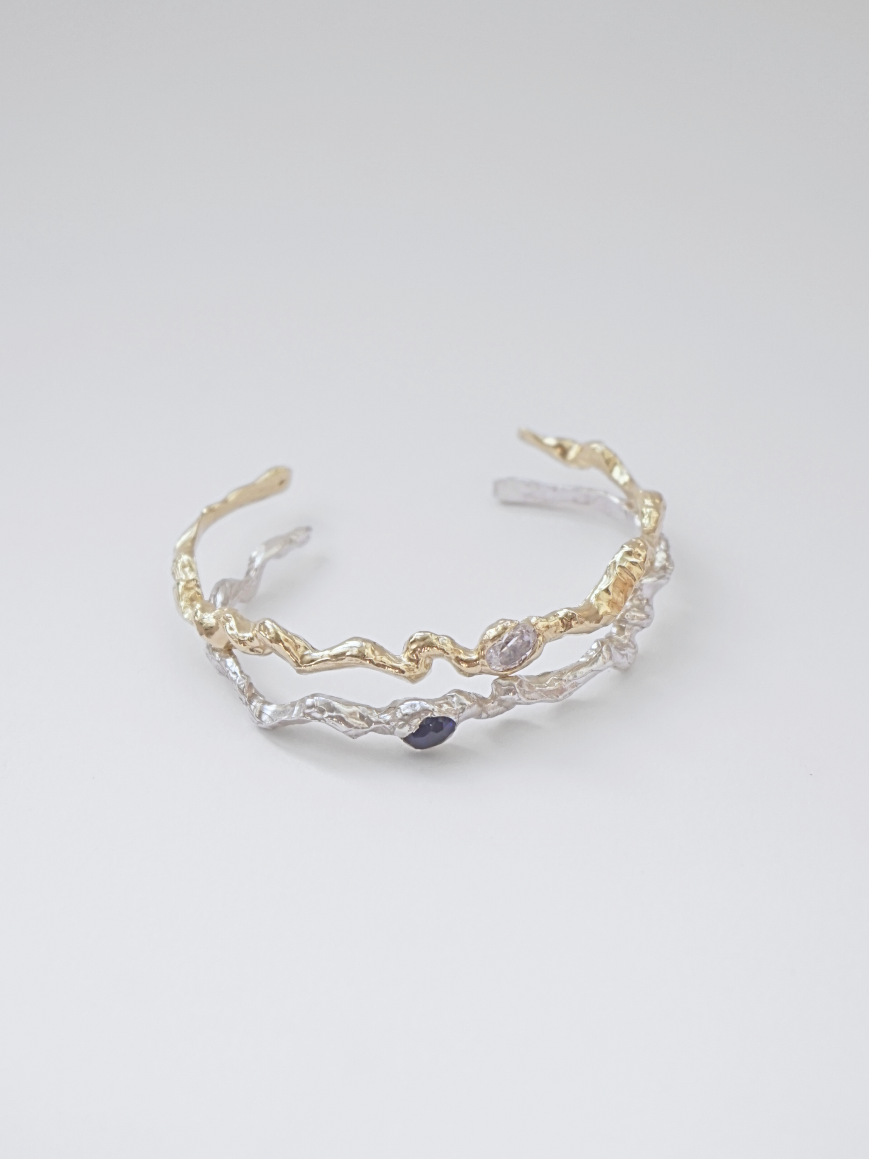 Bracelet made from recycled 925 silver with an organic shape and wavy lines that adapt to the contour of the arm. In one of its curves, the metal embraces a natural stone, integrating it naturally into the design. This bracelet is a reinterpretation of a classic design. Handmade in Barcelona, following the legacy of traditional jewelry, reinterpreted from a contemporary perspective