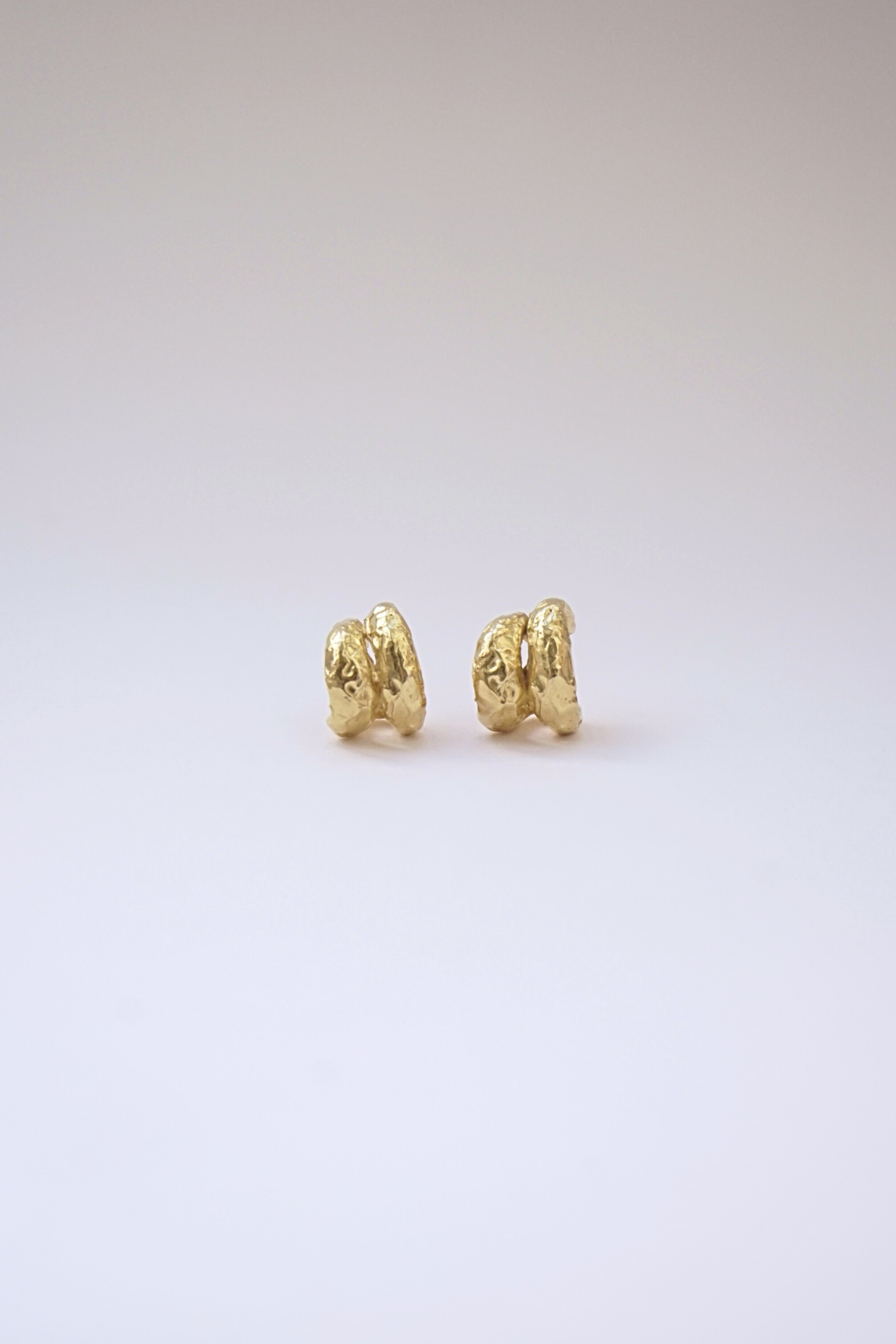 Earcuff made of 925 recycled silver plated in 18k gold composed of two sculptural bodies of different sizes joined together. Its design naturally embraces the ear without the need for piercing.