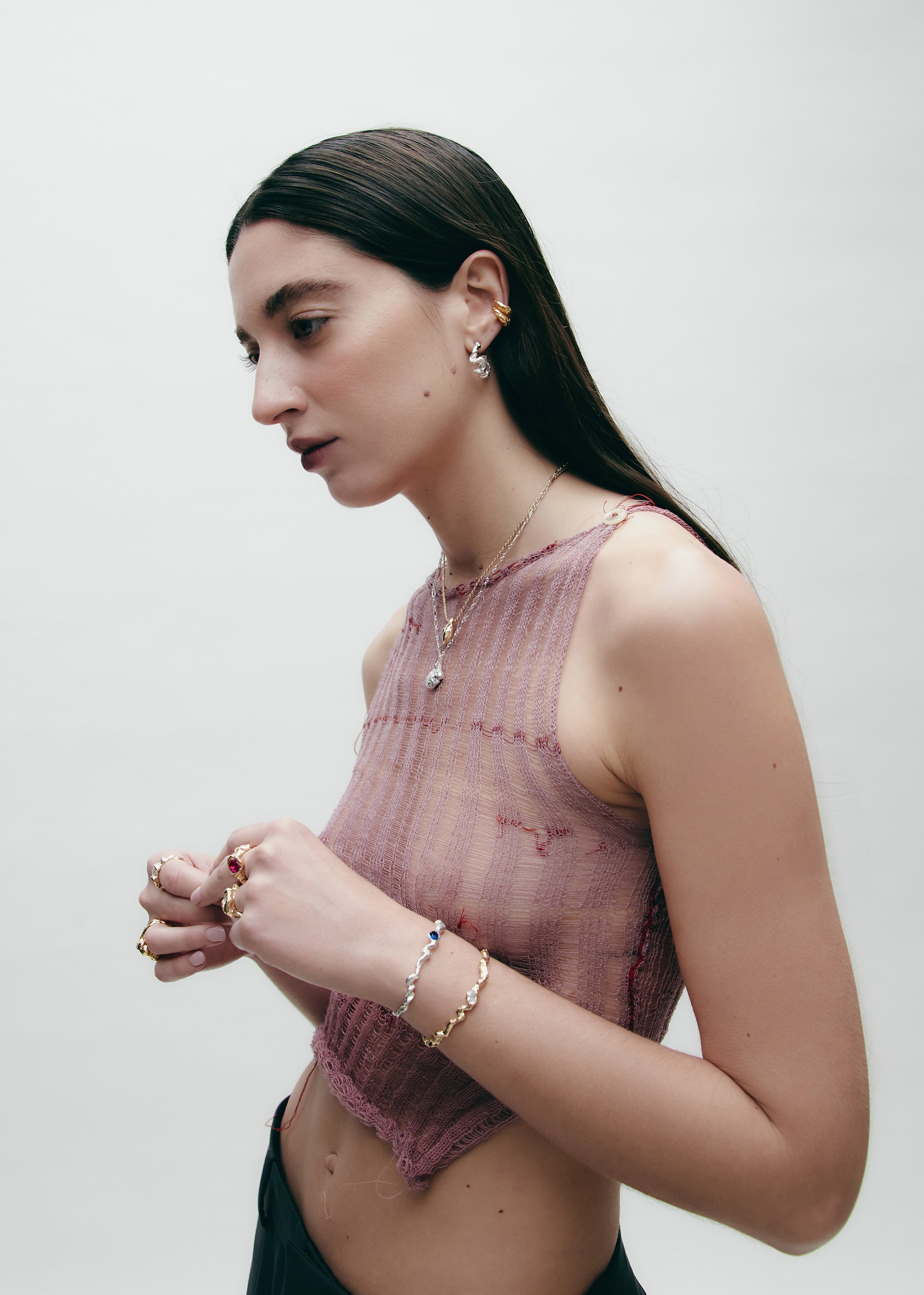 An organic and contemporary piece that stands out for its artisanal character and sculptural form. Handmade in Barcelona, following the legacy of traditional jewelry, reinterpreted from a contemporary perspective.